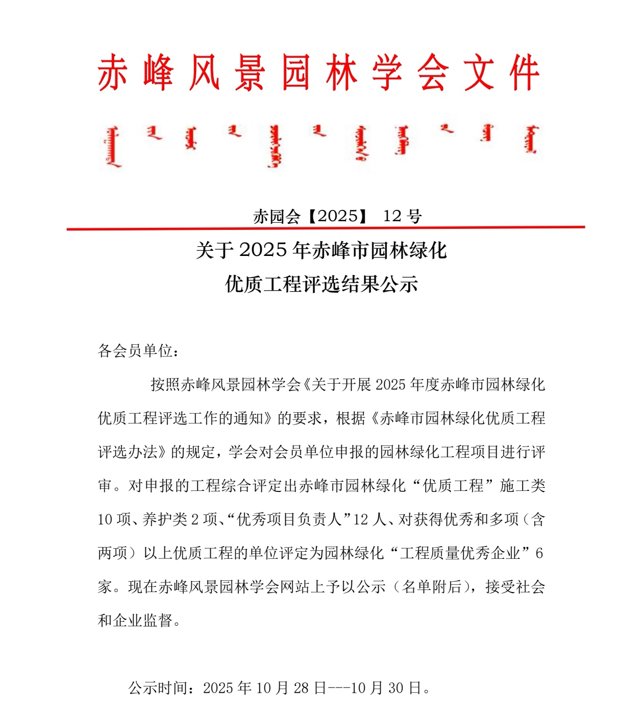 关于2025年度赤峰市园林绿化优质工程评选结果公示的通知