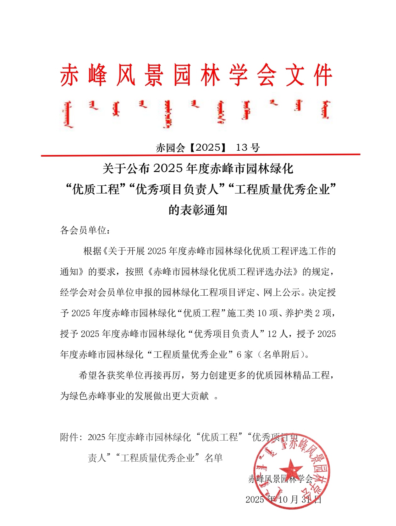 关于公布2025年度赤峰市园林绿化“优质工程”“优秀项目负责人”“工程质量优秀企业”的表彰通知